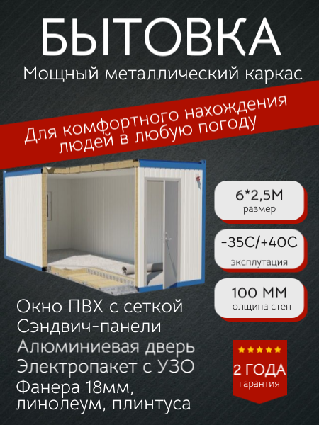 Бытовка 6х2,45 м с утеплением 100 мм — комфорт зимой и летом, герметичная кровля!